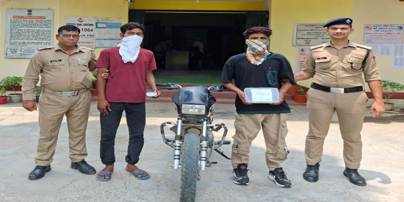 कोतवाली रानीपुर पुलिस ने चिन्मय चौक पर चौंकिग अभियान के दौरान बाइक सवार दो सदिग्धाों को रोकने का प्रयास किया। लेकिन बाइक सवार पुलिस को गच्चा देकर भाग निकले। पुलिस को बाइक सवारों पर शक होने पर उनका पीछा करते हुए कुछ ही दूरी पर घेर घोट कर दोनों को दबोच लिया। जिनकी तलाशी लेने पर उनके पास से एक 315 बोर का तमंचा, दो जिंदा कारतूस, एक चाकू और दो सोने की चेन बरामद की है। पूछताछ के दौरान दोनों आरोपियों ने रानीपुर क्षेत्र में दो चेन स्नेचिंग की वारदात को अंजाम देना स्वीकार किया है। पुलिस ने आरोपियों के खिलाफ सम्बंधिात धााराओं में मामल दर्ज कर लिया। कोतवाली रानीपुर प्रभारी निरीक्षक कमल मोहन भडारी ने बताया कि बीती शाम को पुलिस टीम चिन्मय चौक पर वाहन चौंकिग अभियान पर थी। इसी दौरान बाइक सवार दो संदिग्धाों को रोकने का प्रयास किया। लेकिन बाइक सवार पुलिस टीम को चकमा देकर देकर भाग निकले। जिनपर पुलिस को शक होने पर उनका पीछा कर कुछ ही दूरी पर बाइक सवारों को घेर घोट कर रोक लिया। जिनकी तलाशी लेने पर पुलिस ने उनके पास से 315 बोर का एक तमंचा, दो जिंदा कारतूस, एक चाकू और दो सोने की चेन बरामद की है। पूछताछ के दौरान आरोपियों ने अपना नाम अलीखान पुत्र इशरार अली निवासी ग्राम बढेड़ी राजपुताना थाना बहादराबाद और गुल नवाज पुत्र दिलशाद निवासी ग्राम अलीपुर थाना बहादराबाद बताते हुए खुलासा किया कि उनके द्वारा हाल ही में शिवालिकनगर में एक बुर्जग महिला के गले से सोने की चेन तोड़ने की घटना को अंजाम दिया था। जबकि एक महिला के गले से चेन तोड़ने का प्रयास किया, लेकिन सफल नहीं हो सके। आरोपियों ने सिडकुल मे एक फैक्ट्री के सामने सड़क पर स्कूटी मे सवार पुरुष व महिला को ओवरटेक कर तमंचा दिखाकर महिला के गले से चेन लूट को अंजाम दिया था, जबकि महिला के गले मे झपट्टा मारने के दौरान चेन का आधा हिस्सा वहीं गिर गया था तथा आधा हाथ मे आ गया था। दबोचे गये आरोपी अलीखान ने बताया कि वह पूर्व मे बहादराबाद रूहालकी क्षेत्र मे एक बैंक मे चोरी करने के प्रयास तथा एक अन्य चोरी मामले मे जेल गया था, अभी जमानत पर चल रहा है, केस लडने के लिये पैसो की आवश्यकता थी, इस कारण उसके द्वारा अपने साथी के साथ मिलकर चेन लूटने की योजना बनाई थी।