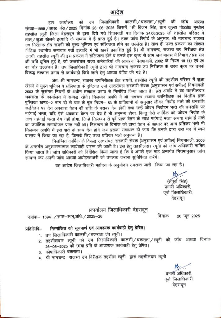 जिलाधिकारी सविन बंसल ने कार्यालय में जुआ खेल रहे राजस्व कार्मिक की फोटोध्वीडयो वायरल होने पर त्वरित संज्ञान लेते हुए उप जिलाधिकारी चकराताध्कालसीध् त्यूनी से जांच कराई। जांच में दोषी पाए जोन पर डीएम ने सम्बन्धित कार्मिक के विरूद्ध त्वरित एक्शन लेतेे हुए राजस्व उप निरीक्षक त्यूनी को निलम्बित कर दिया है। तहसील त्यूनी परिसर में मैन गेट पर राजस्व कर्मियों की सोशल मीडिया पर वायरल वीडियो कि खबर प्रकाशित की गई है डीएम ने उप जिलाधिकारी चकराता को वायरल वीडियों के सम्बन्ध में उप जिलाधिकारी कालसी/चकराता/त्यूनी द्वारा प्रश्नगत प्रकरण की जॉच आख्या प्रस्तुत करने के निर्देश दिए थे। शिकायत पर उप जिलाधिकारी कालसी/चकराता/त्यूनी द्वारा प्रकरण में प्रेषित आख्या में उल्लेख किया कि तहसील कर्मियों द्वारा तहसील परिसर में ही ताशध्जुआ खेला जा रहा था, जिसका मुख्य खिलाड़ी राजस्व उप निरीक्षक क्षेत्र रायगी स्पष्ट दिखायी दे रहा है, साथ ही उक्त प्रकरण का सोशल मीडिया एवं दैनिक समाचार पत्रों में भी खबरें प्रकाशित हुई है। प्रकरण में प्रथम दृष्टया राजस्व उप निरीक्षक क्षेत्र रायगी, तहसील त्यूनी की संलिप्तता स्पष्ट उजागर हो रही है। ऐसे कृत्य से आम जन मानस में विभाग ध् प्रशासन की छवि धूमिल हुई है। राजस्व उप निरीक्षक के विरूद्ध विभागीय आचरण नियमों के उल्लघंन करने पर तत्काल प्रभाव से उचित कार्यवाही किये जाने हेतु डीएम को आख्या प्रेषित की गई। उप जिलाधिकारी कालसी/चकराता/त्यूनी से प्राप्त आख्या, जांच में की गई संस्तुति के आधार पर जिलाधिकारी ने नागचन्द, राजस्व उपनिरीक्षक क्षेत्र रायगी, तहसील त्यूनी के विरूद्ध संलिप्तता सिद्ध होने तथा उत्तराखण्ड राज्य कर्मचारियों की आचरण नियमावली का भी उल्लंघन किये जाने पर तत्काल प्रभाव से निलंबित किया कर दिया है, निलम्बन अवधि में राजस्व उपनिरीक्षक रायगी को तहसीलदार चकराता के कार्यालय में सम्बद्ध कर दिया है। प्रकरण में तहसीलदार त्यूनी को जांच अधिकारी, नामित करते हुए विस्तृत जांच के निर्देश दिए गए हैं।