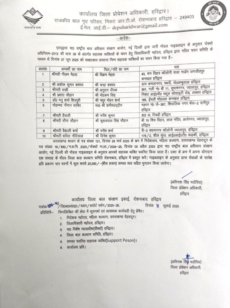 उत्तराखंड महिला कल्याण विभाग द्वारा यौन शोषण से पीड़ित बच्चों को न्यायिक प्रक्रिया के दौरान समुचित सहयोग एवं सुरक्षा प्रदान करने के लिए पोक्सो अधिनियम-2012 की धारा 39 के तहत जनपद स्तर पर “सहायक व्यक्तियों” का पैनल गठित किया जा रहा है। इसी क्रम में हरिद्वार जनपद से राखी पत्नी अनुराग दीपक, निवासी 591, गली नंबर बी-11, सुभाषनगर, ज्वालापुर, हरिद्वार को सहायक व्यक्ति के रूप में नामित किया गया है।